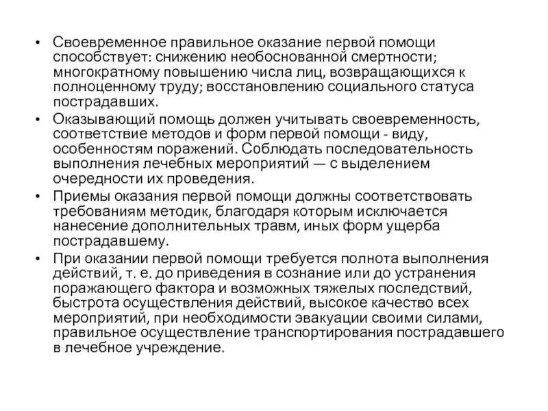 При оказании первой помощи требуется полнота выполнения действий, т. е. до приведения в сознание или до устранения поражающего фактора и возможных тяжелых последствий, быстрота осуществления действий, высокое качество всех мероприятий, при необходимости эвакуации своими силами, правильное осуществление транспортирования пострадавшего в лечебное учреждение.