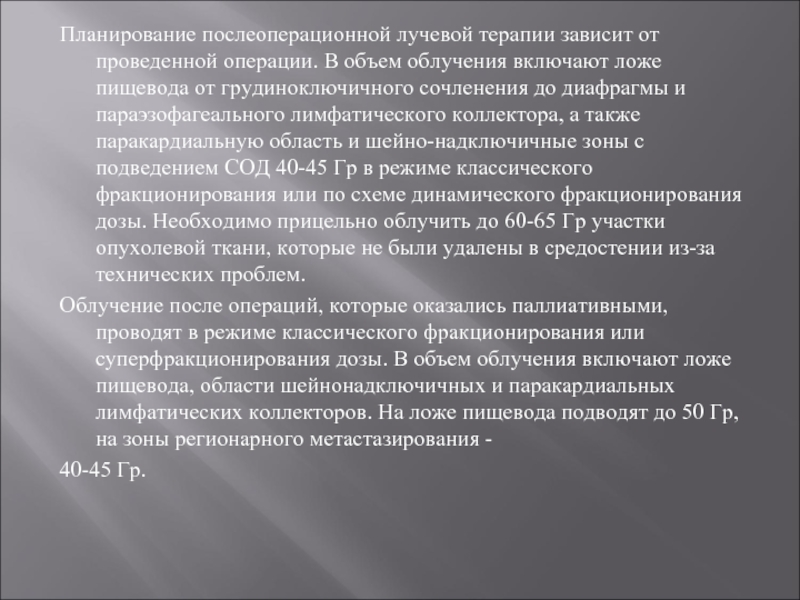 Облучение после операций, которые оказались паллиативными, проводят в режиме классического фракционирования или суперфракционирования дозы. В объем облучения включают ложе пищевода, области шейнонадключичных и паракардиальных лимфатических коллекторов. На ложе пищевода подводят до 50 Гр, на зоны регионарного метастазирования -