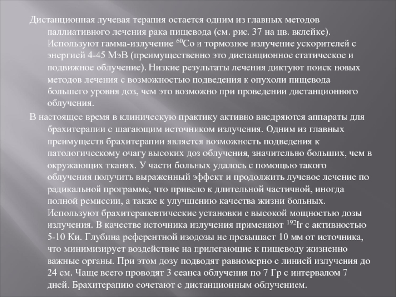 пищевода (см. рис. 37 на цв. вклейке). Используют гамма-излучение 60Со и тормозное излучение ускорителей с энергией 4-45 МэВ (преимущественно это дистанционное статическое и подвижное облучение). Низкие результаты лечения диктуют поиск новых методов лечения с возможностью подведения к опухоли пищевода большего уровня доз, чем это возможно при проведении дистанционного облучения.