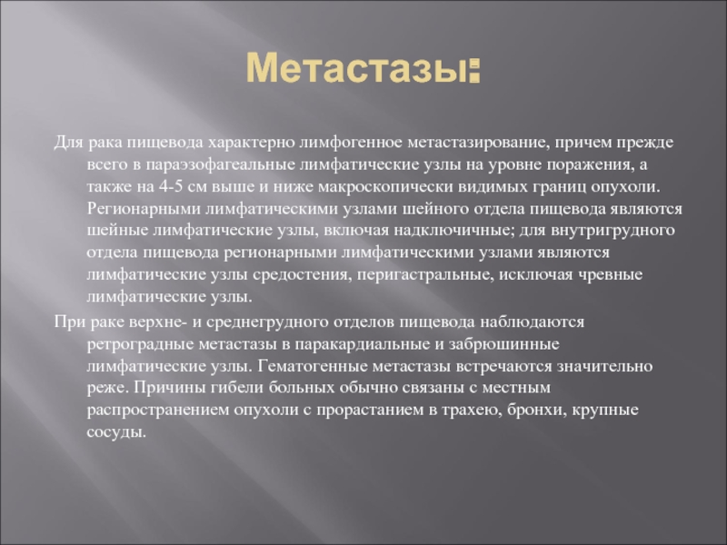 При раке верхне- и среднегрудного отделов пищевода наблюдаются ретроградные метастазы в паракардиальные и забрюшинные лимфатические узлы. Гематогенные метастазы встречаются значительно реже. Причины гибели больных обычно связаны с местным распространением опухоли с прорастанием в трахею, бронхи, крупные сосуды.