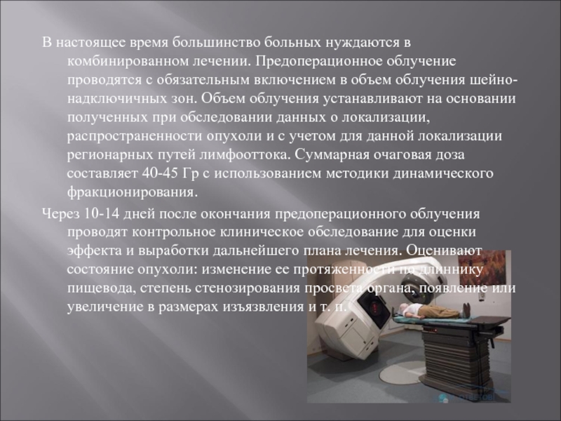 Слайд 12В настоящее время большинство больных нуждаются в комбинированном лечении. Предоперационное облучение