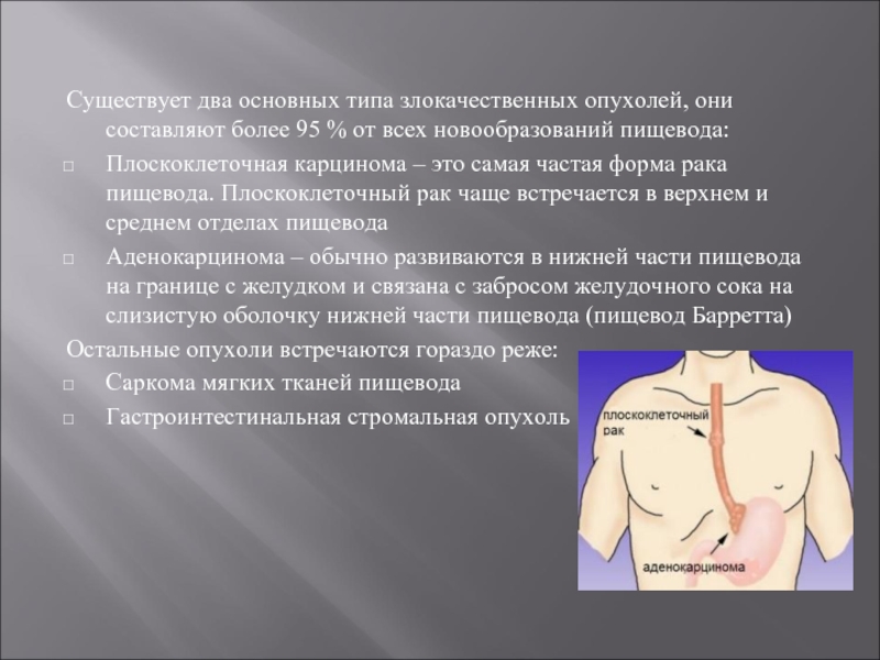 Аденокарцинома – обычно развиваются в нижней части пищевода на границе с желудком и связана с забросом желудочного сока на слизистую оболочку нижней части пищевода (пищевод Барретта)