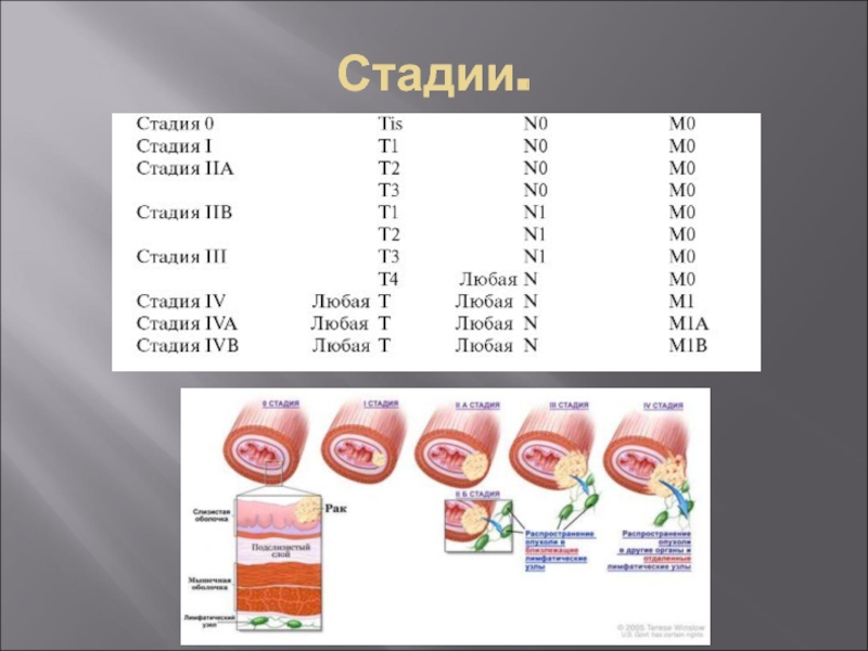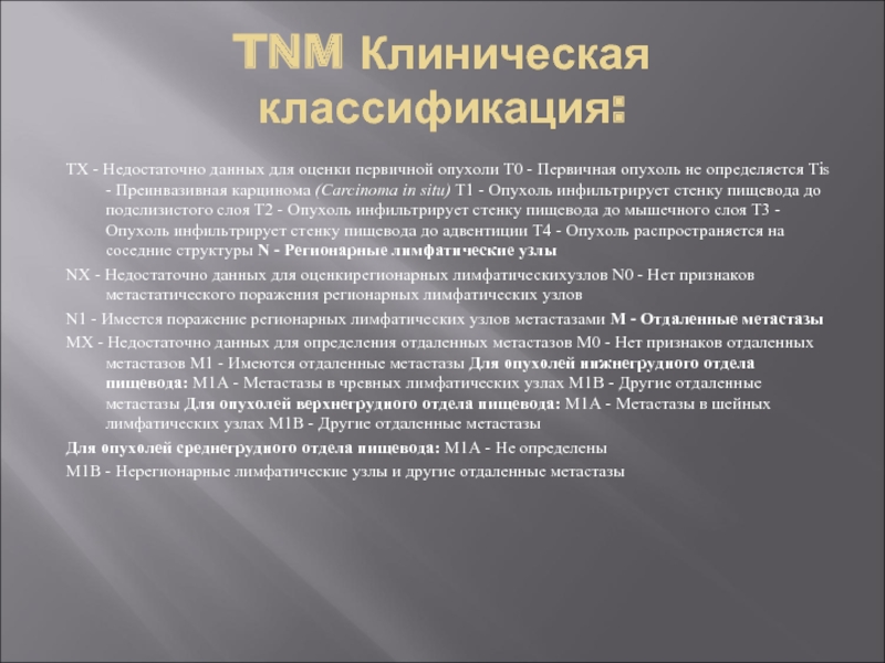 - Первичная опухоль не определяется Tis - Преинвазивная карцинома (Carcinoma in situ) T1 - Опухоль инфильтрирует стенку пищевода до подслизистого слоя T2 - Опухоль инфильтрирует стенку пищевода до мышечного слоя Т3 - Опухоль инфильтрирует стенку пищевода до адвентиции T4 - Опухоль распространяется на соседние структуры N - Регионарные лимфатические узлы