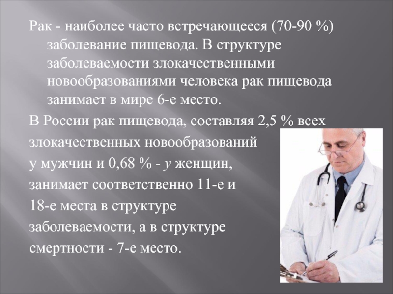 Слайд 2Рак - наиболее часто встречающееся (70-90 %) заболевание пищевода. В структуре