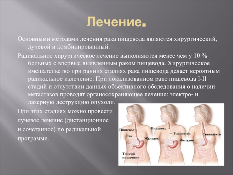 Основными методами лечения рака пищевода являются хирургический, лучевой и комбинированный.