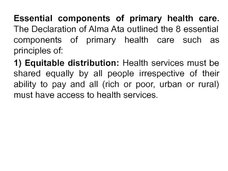 1) Equitable distribution: Health services must be shared equally by all people irrespective of their ability to pay and all (rich or poor, urban or rural) must have access to health services.