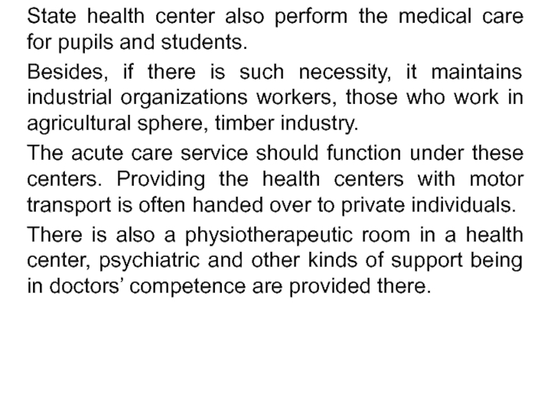 Слайд 35State health center also perform the medical care for pupils and