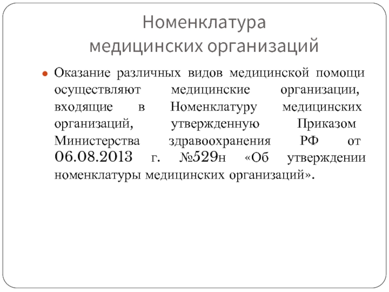 входящие в Номенклатуру медицинских организаций, утвержденную Приказом Министерства здравоохранения РФ от 06.08.2013 г. №529н «Об утверждении номенклатуры медицинских организаций».