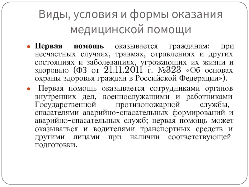 Первая помощь оказывается сотрудниками органов внутренних дел, военнослужащими и работниками Государственной противопожарной службы, спасателями аварийно-спасательных формирований и аварийно-спасательных служб; первая помощь может оказываться и водителями транспортных средств и другими лицами при наличии соответствующей подготовки.