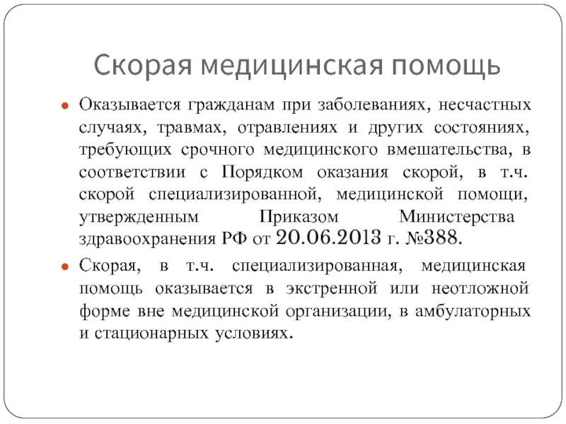 и других состояниях, требующих срочного медицинского вмешательства, в соответствии с Порядком оказания скорой, в т.ч. скорой специализированной, медицинской помощи, утвержденным Приказом Министерства здравоохранения РФ от 20.06.2013 г. №388.