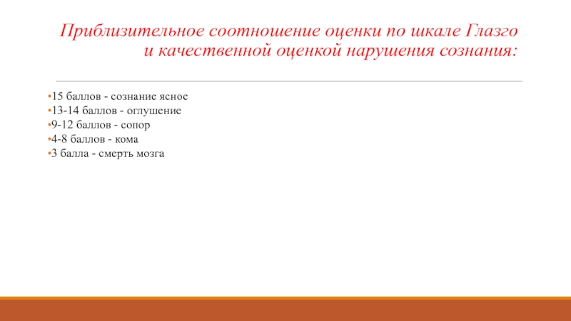 Слайд 11Приблизительное соотношение оценки по шкале Глазго и качественной оценкой нарушения сознания: