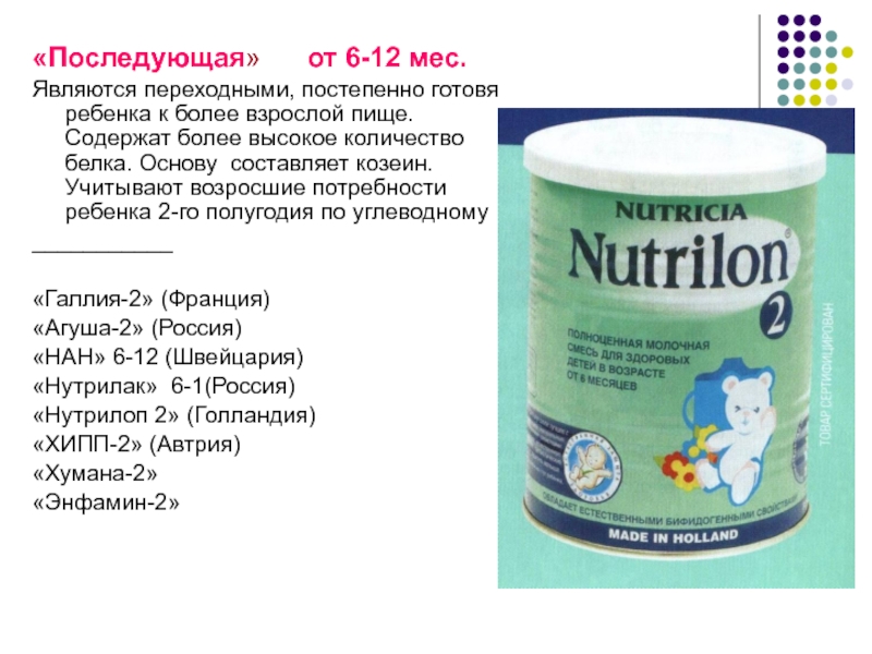 более взрослой пище. Содержат более высокое количество белка. Основу составляет козеин. Учитывают возросшие потребности ребенка 2-го полугодия по углеводному