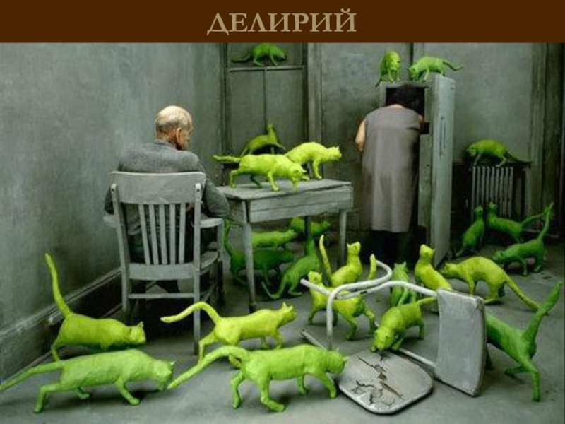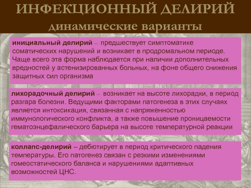 лихорадочный делирий – возникает на высоте лихорадки, в период разгара болезни. Ведущими факторами патогенеза в этих случаях является интоксикация, связанная с напряженностью иммунологического конфликта, а также повышение проницаемости гематоэнцефалического барьера на высоте температурной реакции