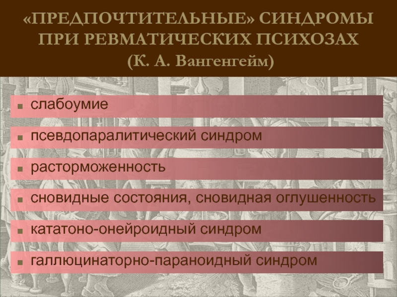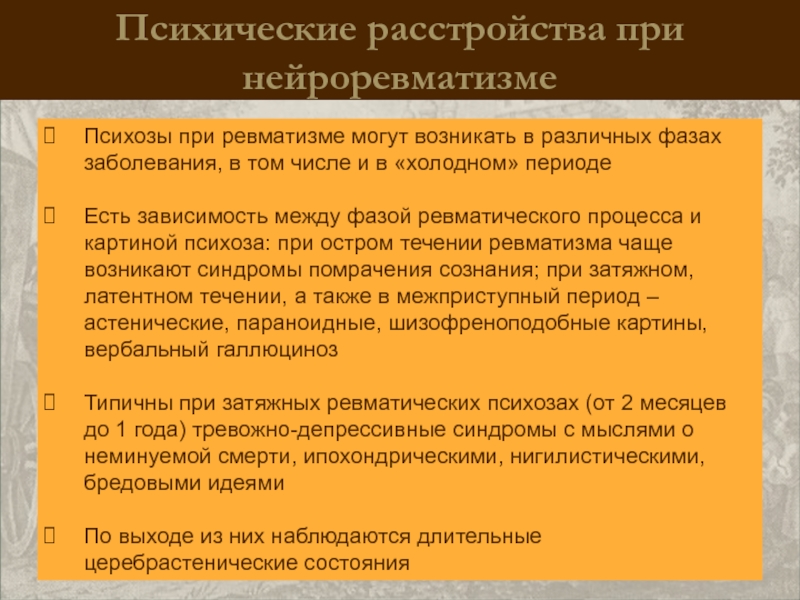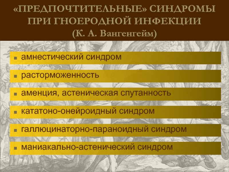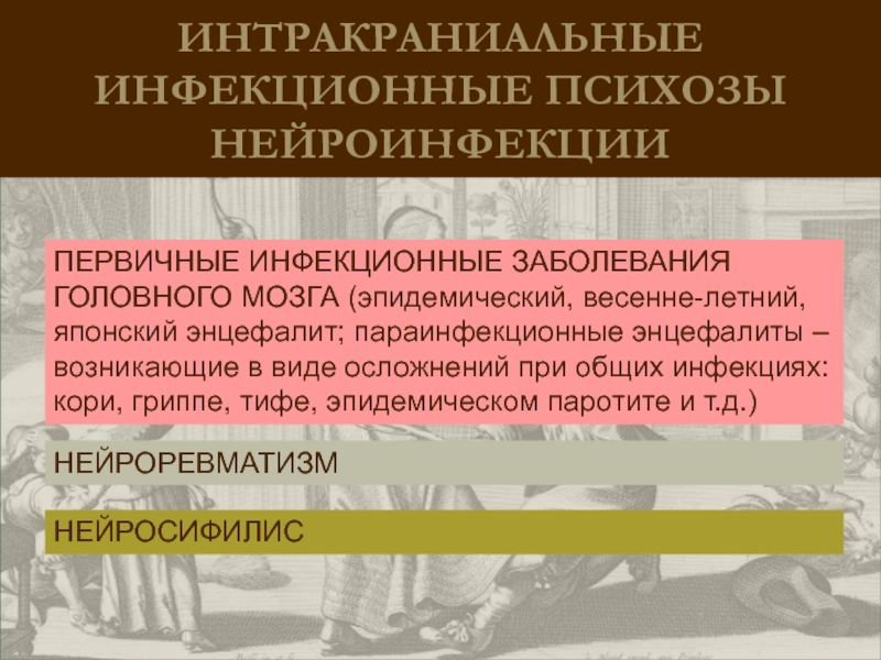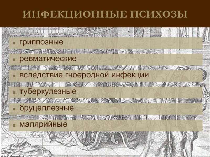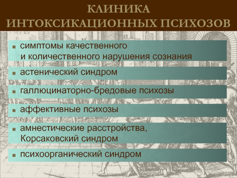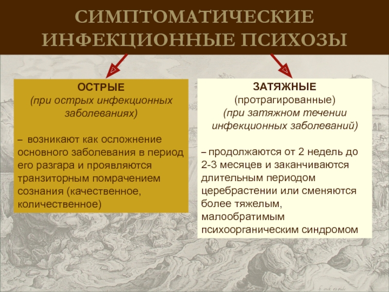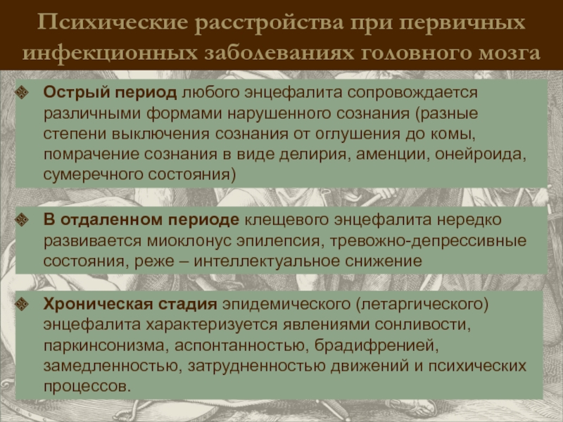 II – клиника менингита или менингоэнцефалита – на их фоне – нарушения сознания, галлюцинозы, галлюцинаторно-бредовые с-мы
