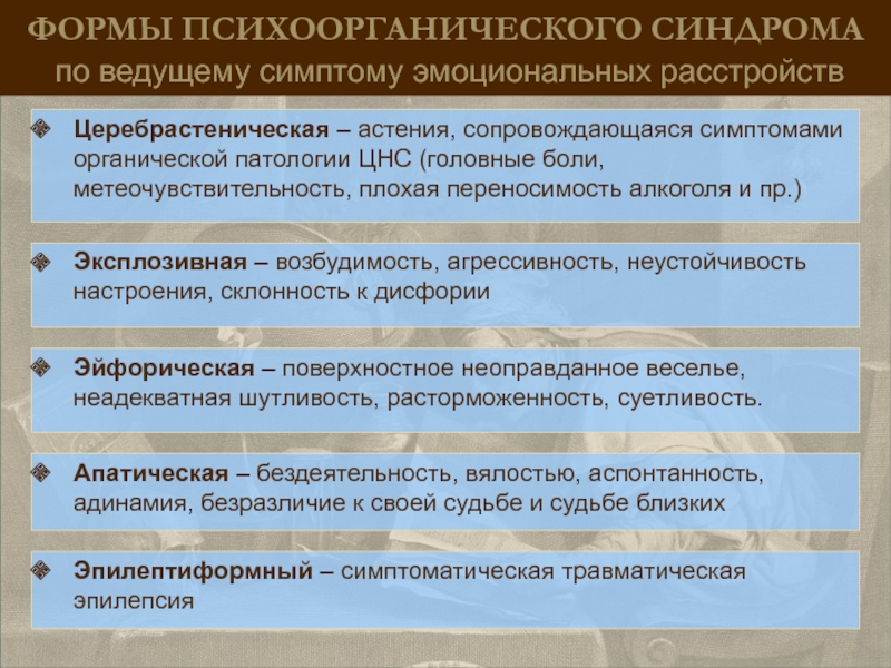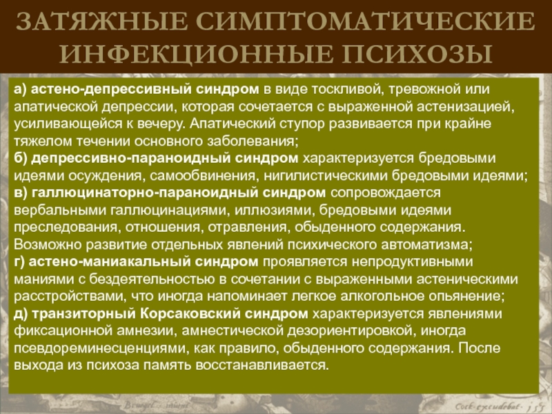 – продолжаются от 2 недель до 2-3 месяцев и заканчиваются длительным периодом церебрастении или сменяются более тяжелым, малообратимым психоорганическим синдромом
