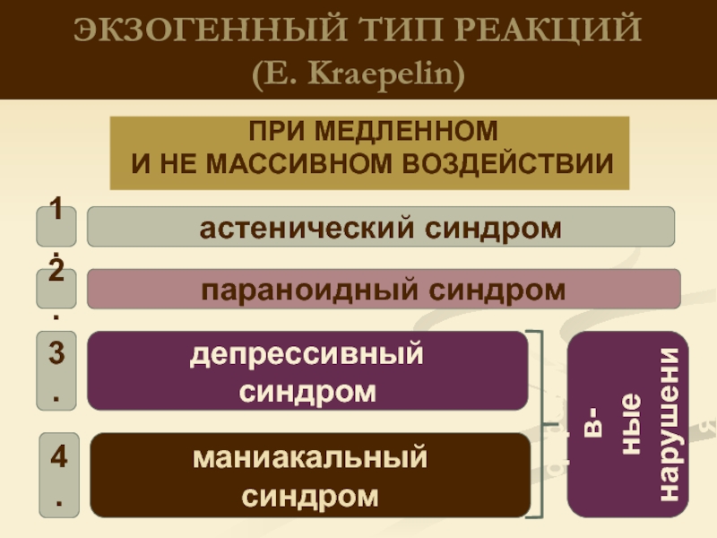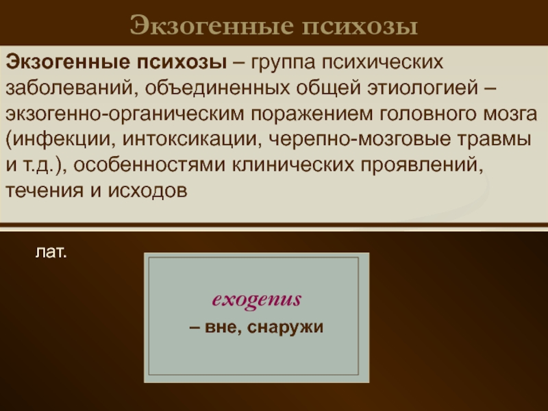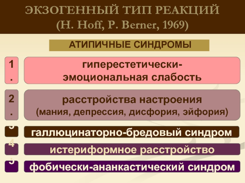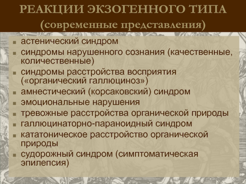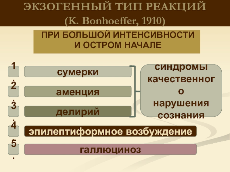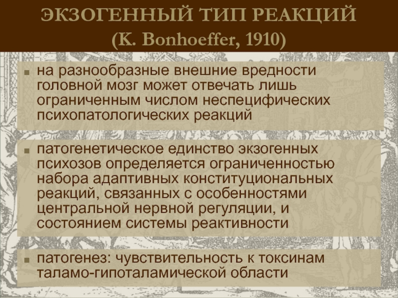 патогенетическое единство экзогенных психозов определяется ограниченностью набора адаптивных конституциональных реакций, связанных с особенностями центральной нервной регуляции, и состоянием системы реактивности