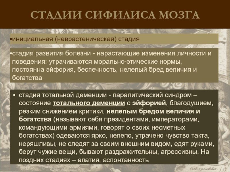 стадия развития болезни - нарастающие изменения личности и поведения: утрачиваются морально-этические нормы, постоянна эйфория, беспечность, нелепый бред величия и богатства