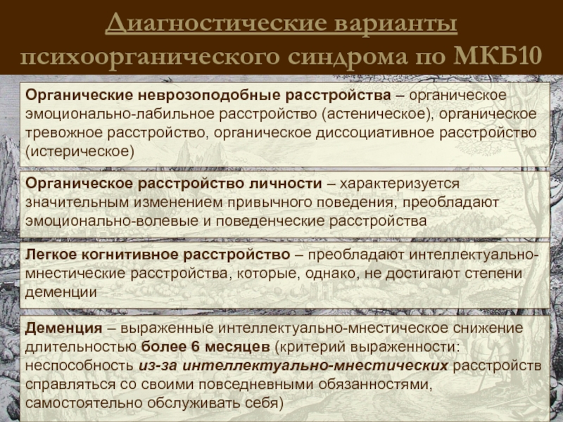 Легкое когнитивное расстройство – преобладают интеллектуально-мнестические расстройства, которые, однако, не достигают степени деменции