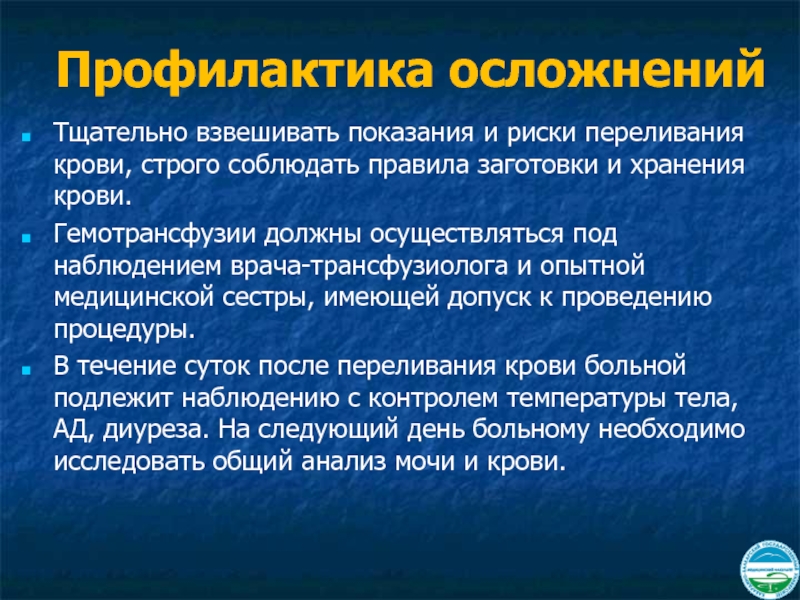 Тщательно взвешивать показания и риски переливания крови, строго соблюдать правила