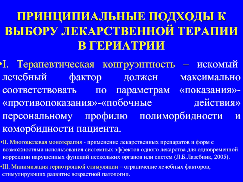 I. Терапевтическая конгруэнтность – искомый лечебный фактор должен максимально соответствовать по параметрам «показания»-«противопоказания»-«побочные действия» персональному профилю полиморбидности и коморбидности пациента.