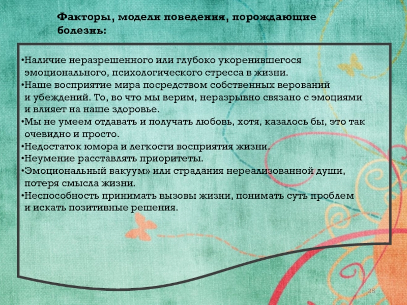 Факторы, модели поведения, порождающие болезнь: