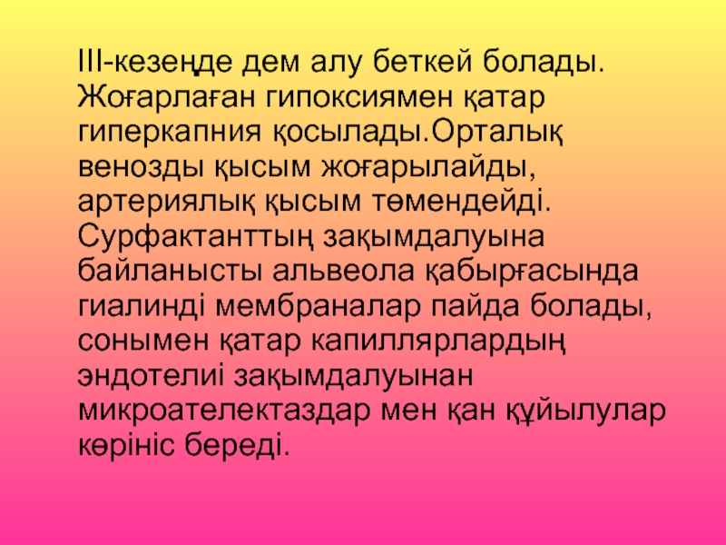 Слайд 16 ІІІ-кезеңде дем алу беткей болады.Жоғарлаған гипоксиямен қатар гиперкапния қосылады.Орталық