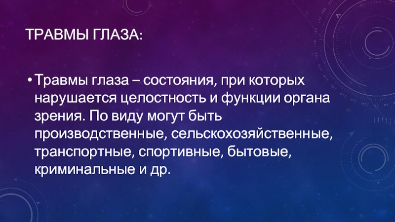 Слайд 2ТРАВМЫ ГЛАЗА: