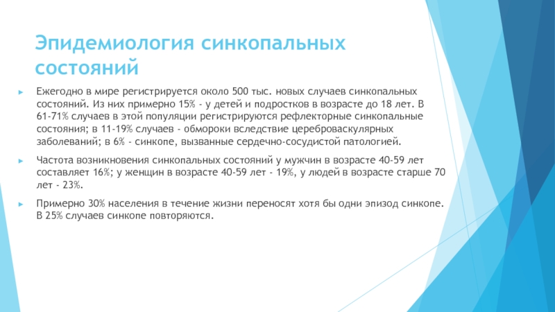 синкопальных состояний. Из них примерно 15% - у детей и подростков в возрасте до 18 лет. В 61-71% случаев в этой популяции регистрируются рефлекторные синкопальные состояния; в 11-19% случаев - обмороки вследствие цереброваскулярных заболеваний; в 6% - синкопе, вызванные сердечно-сосудистой патологией.