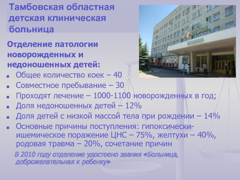 В 2010 году отделение удостоено звания «Больница, доброжелательная к ребенку»