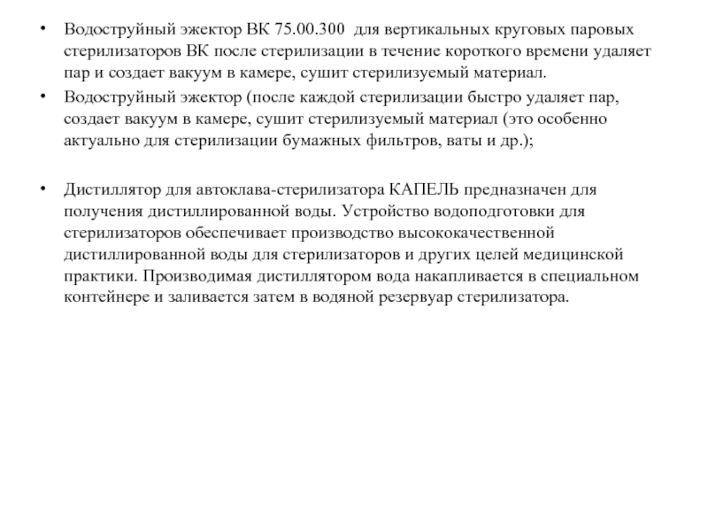 Водоструйный эжектор (после каждой стерилизации быстро удаляет пар, создает вакуум в камере, сушит стерилизуемый материал (это особенно актуально для стерилизации бумажных фильтров, ваты и др.);