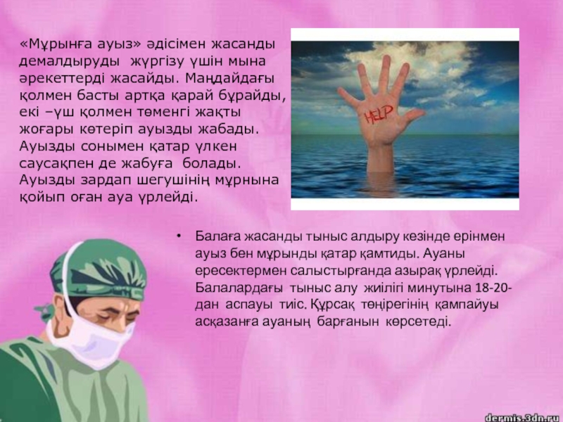 «Мұрынға ауыз» әдісімен жасанды демалдыруды жүргізу үшін мына әрекеттерді жасайды. Маңдайдағы қолмен басты артқа қарай бұрайды, екі –үш қолмен төменгі жақты жоғары көтеріп ауызды жабады. Ауызды сонымен қатар үлкен саусақпен де жабуға болады. Ауызды зардап шегушінің мұрнына қойып оған ауа үрлейді.