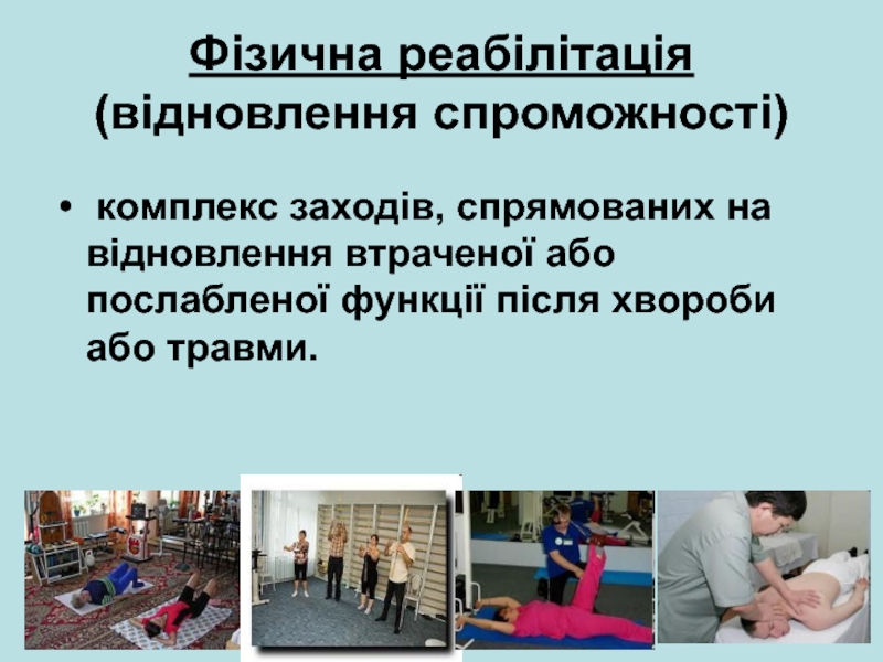 Слайд 15Фізична реабілітація (відновлення спроможності)
