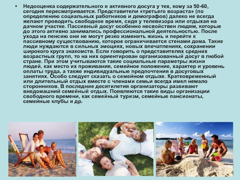 пересматривается. Представители «третьего возраста» (по определению социальных работников и демографов) далеко не всегда желают проводить свободное время, сидя у телевизора или отдыхая на дачном участке. Пассивный досуг особенно несвойствен людям, которые до этого активно занимались профессиональной деятельностью. После ухода на пенсию они не могут резко изменить жизнь и перейти к пассивному существованию, которое ограничивается стенами дома. Такие люди нуждаются в сильных эмоциях, новых впечатлениях, сохранении широкого круга знакомств. Если говорить о представителях средних возрастных групп, то на них ориентирован организованный досуг в любой стране. При этом учитываются такие социальные параметры жизни людей, как место их проживания, семейное положение, характер и уровень оплаты труда, а также индивидуальные предпочтения в досуговых занятиях. Особо следует сказать о семейном отдыхе. Кратковременный или длительный отдых вместе с членами семьи всегда имел немало сторонников. В последние десятилетия организаторы развивают внедомашний семейный отдых. Появляются такие виды организации свободного времени, как семейный туризм, семейные пансионаты, семейные клубы и др.