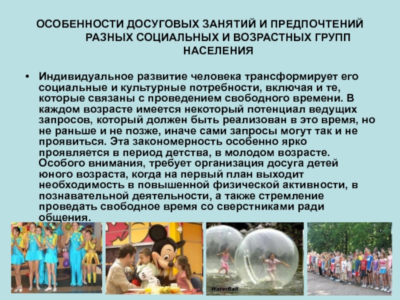 развитие человека трансформирует его социальные и культурные потребности, включая и те, которые связаны с проведением свободного времени. В каждом возрасте имеется некоторый потенциал ведущих запросов, который должен быть реализован в это время, но не раньше и не позже, иначе сами запросы могут так и не проявиться. Эта закономерность особенно ярко проявляется в период детства, в молодом возрасте. Особого внимания, требует организация досуга детей юного возраста, когда на первый план выходит необходимость в повышенной физической активности, в познавательной деятельности, а также стремление проведать свободное время со сверстниками ради общения.