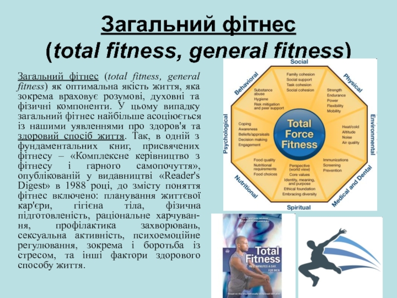 як оптимальна якість життя, яка зокрема враховує розумові, духовні та фізичні компоненти. У цьому випадку загальний фітнес найбільше асоціюється із нашими уявленнями про здоров'я та здоровий спосіб життя. Так, в одній з фундаментальних книг, присвячених фітнесу – «Комплексне керівництво з фітнесу і гарного самопочуття», опублікованій у видавництві «Reader's Digest» в 1988 році, до змісту поняття фітнес включено: планування життєвої кар'єри, гігієна тіла, фізична підготовленість, раціональне харчуван-ня, профілактика захворювань, сексуальна активність, психоемоційне регулювання, зокрема і боротьба із стресом, та інші фактори здорового способу життя.