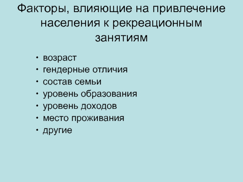 Слайд 61Факторы, влияющие на привлечение населения к рекреационным занятиям