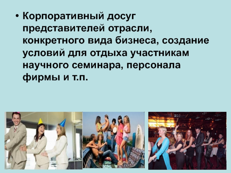 Слайд 80Корпоративный досуг представителей отрасли, конкретного вида бизнеса, создание условий для отдыха