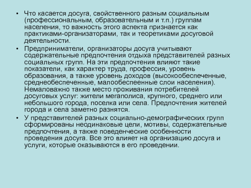 У представителей разных социально-демографических групп сформированы неодинаковые цели, мотивы, содержательные предпочтения, а также поведенческие особенности проведения досуга. Все это влияет на организацию досуга и услуги, которые оказываются в его проведении.