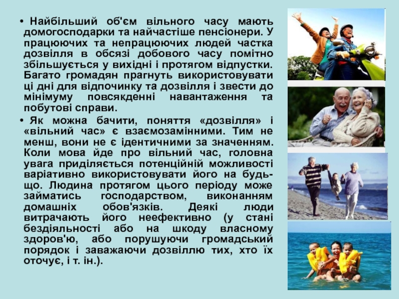 Слайд 13 Найбільший об'єм вільного часу мають домогосподарки та найчастіше пенсіонери. У