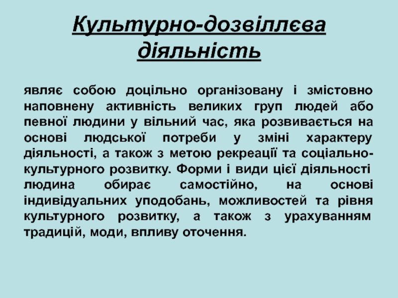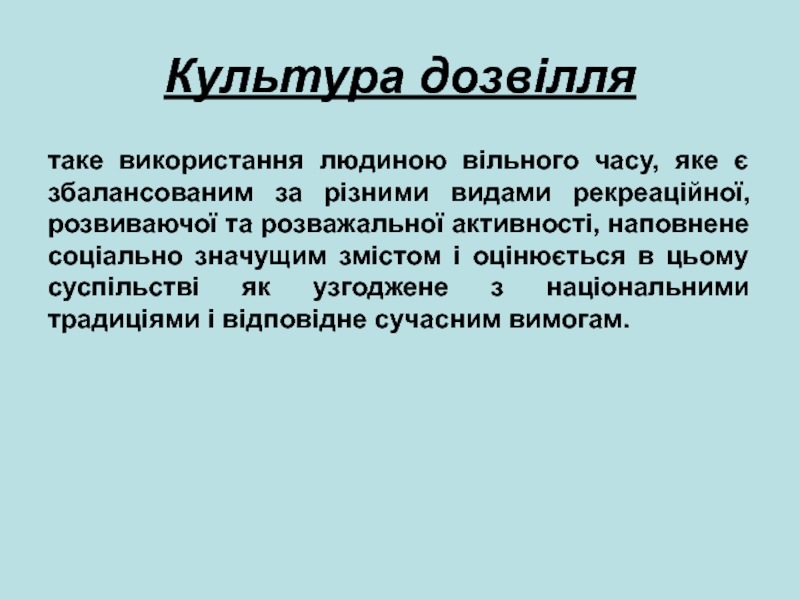 видами рекреаційної, розвиваючої та розважальної активності, наповнене соціально значущим змістом і оцінюється в цьому суспільстві як узгоджене з національними традиціями і відповідне сучасним вимогам.