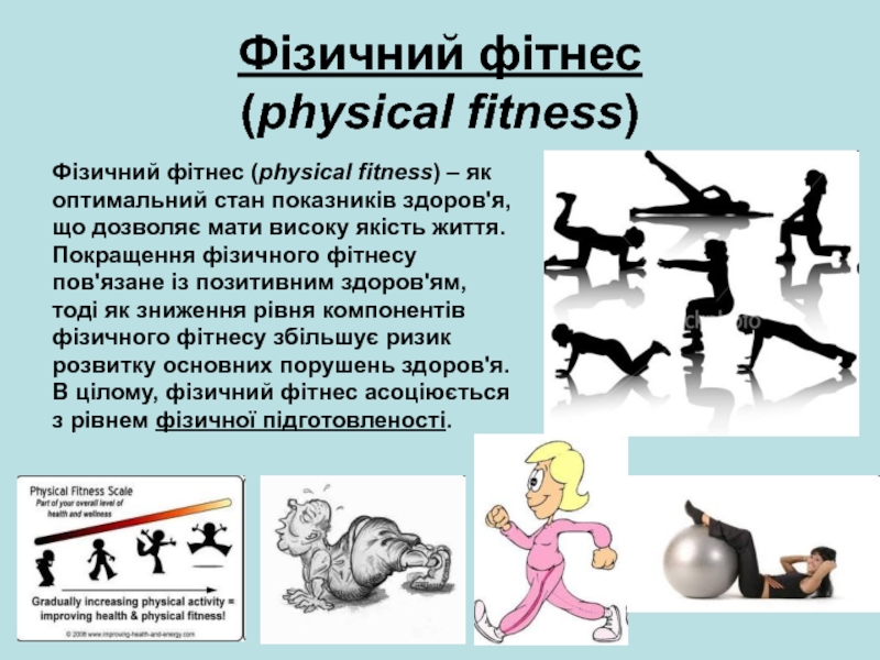 показників здоров'я, що дозволяє мати високу якість життя. Покращення фізичного фітнесу пов'язане із позитивним здоров'ям, тоді як зниження рівня компонентів фізичного фітнесу збільшує ризик розвитку основних порушень здоров'я. В цілому, фізичний фітнес асоціюється з рівнем фізичної підготовленості.