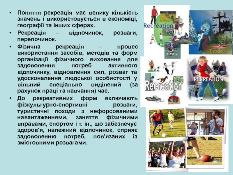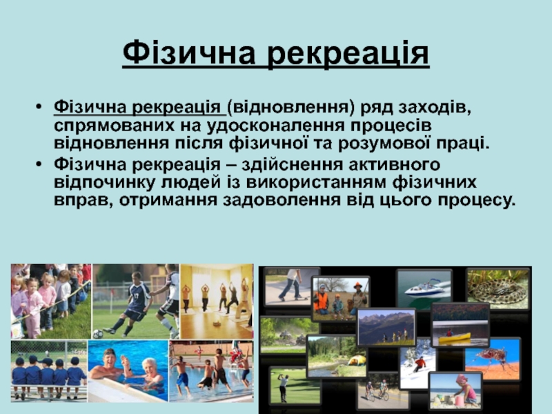 Фізична рекреація – здійснення активного відпочинку людей із використанням фізичних вправ, отримання задоволення від цього процесу.