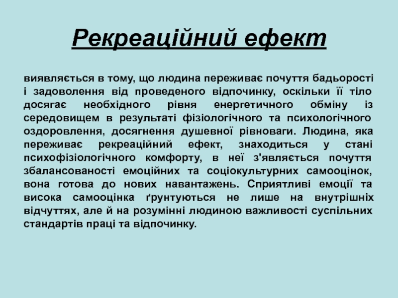 від проведеного відпочинку, оскільки її тіло досягає необхідного рівня енергетичного обміну із середовищем в результаті фізіологічного та психологічного оздоровлення, досягнення душевної рівноваги. Людина, яка переживає рекреаційний ефект, знаходиться у стані психофізіологічного комфорту, в неї з'являється почуття збалансованості емоційних та соціокультурних самооцінок, вона готова до нових навантажень. Сприятливі емоції та висока самооцінка ґрунтуються не лише на внутрішніх відчуттях, але й на розумінні людиною важливості суспільних стандартів праці та відпочинку.