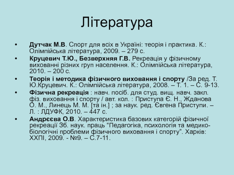 Фізична рекреація : навч. посіб. для студ. вищ. навч. закл. фіз. виховання і спорту / авт. кол. : Приступа Є. Н., Жданова О. М., Линець М. М. [та ін.] ; за наук. ред. Євгена Приступи. – Л. : ЛДУФК, 2010. – 447 с.