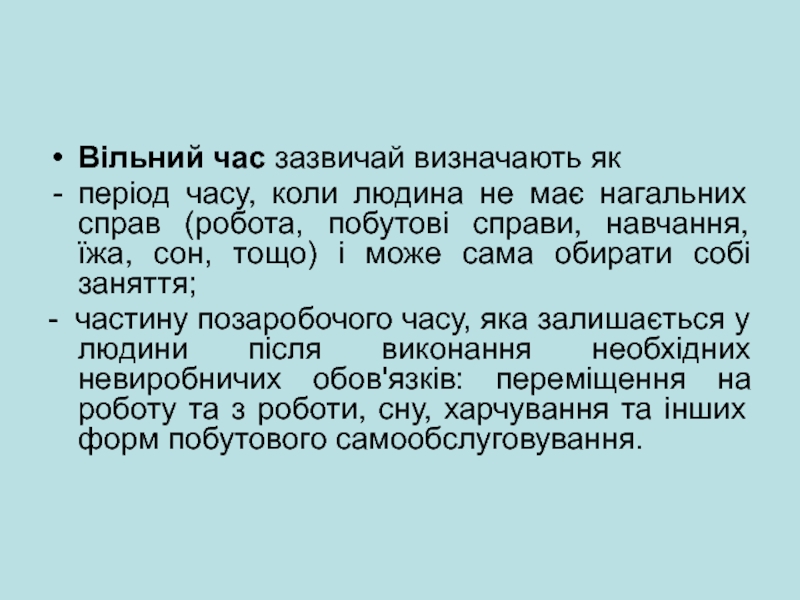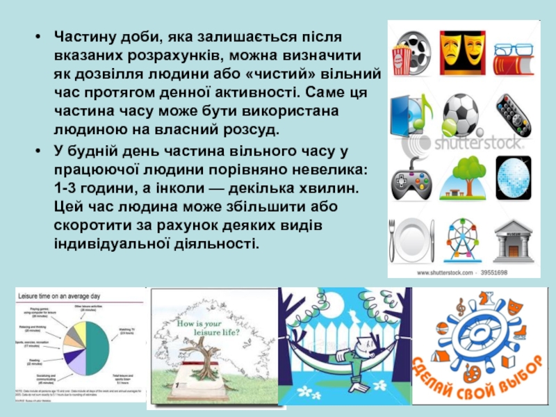 Слайд 10Частину доби, яка залишається після вказаних розрахунків, можна визначити як дозвілля