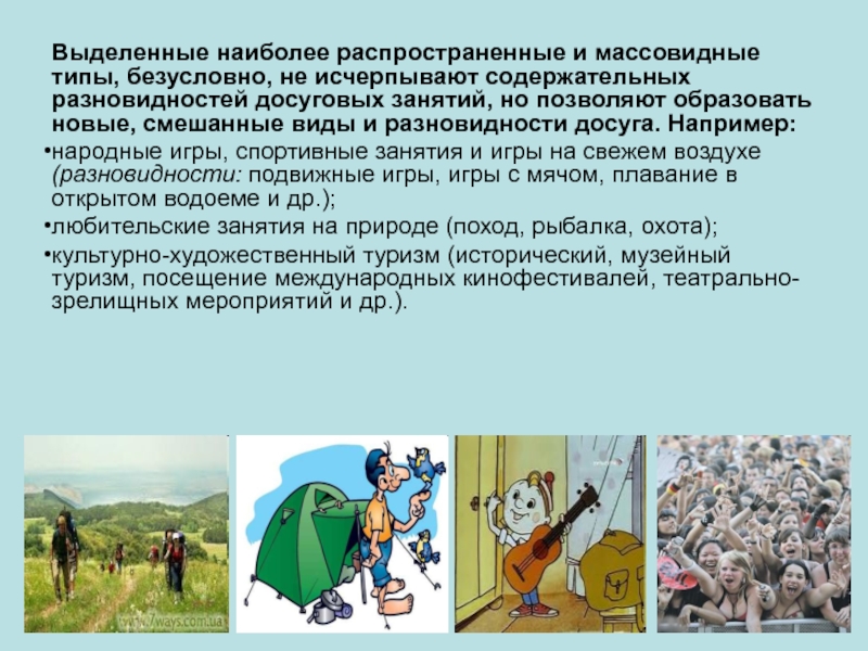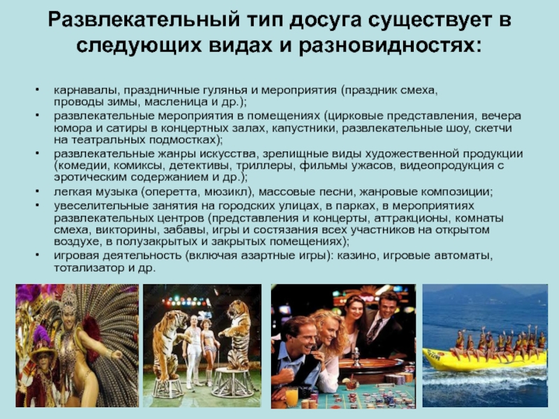 Слайд 54Развлекательный тип досуга существует в следующих видах и разновидностях: