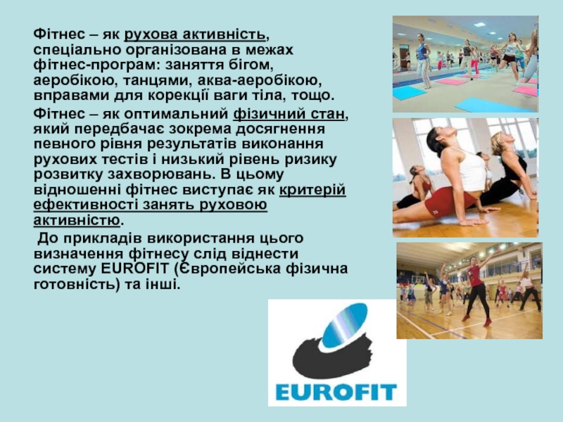 Слайд 22Фітнес – як рухова активність, спеціально організована в межах фітнес-програм: заняття