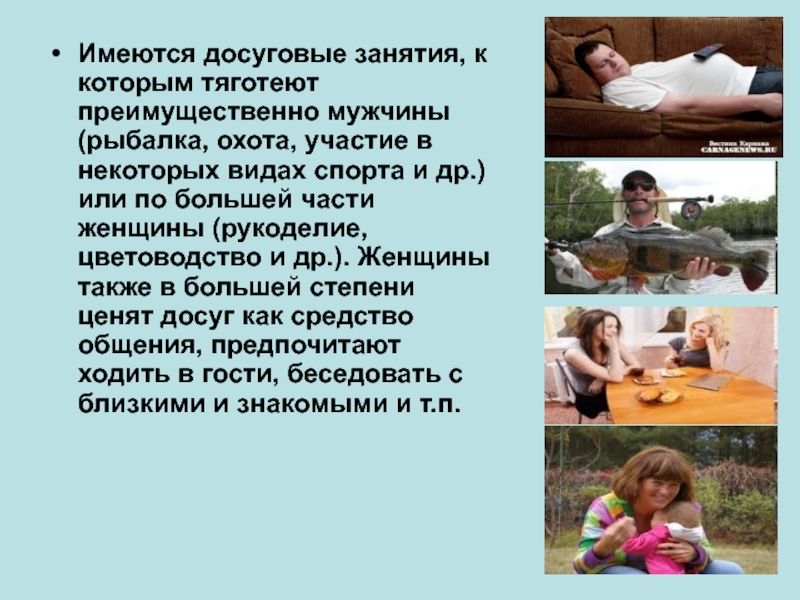 Слайд 81Имеются досуговые занятия, к которым тяготеют преимущественно мужчины (рыбалка, охота, участие