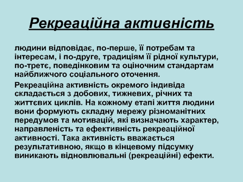 Рекреаційна активність окремого індивіда складається з добових, тижневих, річних та життєвих циклів. На кожному етапі життя людини вони формують складну мережу різноманітних передумов та мотивацій, які визначають характер, направленість та ефективність рекреаційної активності. Така активність вважається результативною, якщо в кінцевому підсумку виникають відновлювальні (рекреаційні) ефекти.