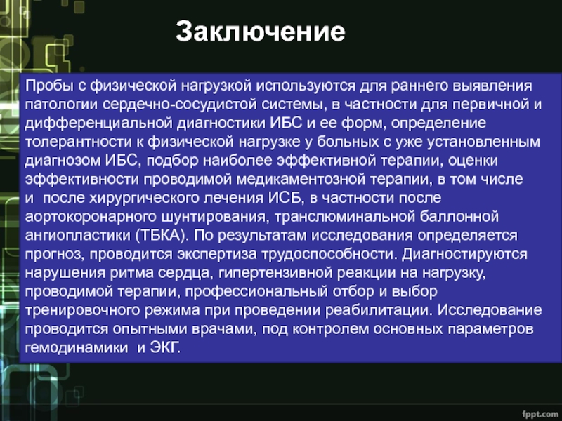 системы, в частности для первичной и дифференциальной диагностики ИБС и ее форм, определение толерантности к физической нагрузке у больных с уже установленным диагнозом ИБС, подбор наиболее эффективной терапии, оценки эффективности проводимой медикаментозной терапии, в том числе и после хирургического лечения ИСБ, в частности после аортокоронарного шунтирования, транслюминальной баллонной ангиопластики (ТБКА). По результатам исследования определяется прогноз, проводится экспертиза трудоспособности. Диагностируются нарушения ритма сердца, гипертензивной реакции на нагрузку, проводимой терапии, профессиональный отбор и выбор тренировочного режима при проведении реабилитации. Исследование проводится опытными врачами, под контролем основных параметров гемодинамики и ЭКГ.